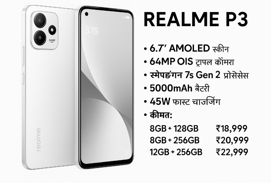 अब Realme ने साल 2025 की शुरुआत में अपना नया स्मार्टफोन Realme P3 लॉन्च किया है। यह फोन खास तौर पर मिड-रेंज सेगमेंट में उन यूज़र्स को टारगेट करता है जो बेहतरीन कैमरा, स्मूथ डिस्प्ले, दमदार बैटरी और 5G कनेक्टिविटी चाहते हैं